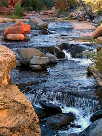 Ahead of us is Slide Rock State Park. If you have your windows rolled down you might begin to hear the sounds of delight, as swimmers slide down the red rocks into Oak Creek. This is a favorite spot to play in the creek. The spectacular red rock spires here send the imagination on flights of fancy, suggesting a giant cathedral or a mystical city of Red Rock.